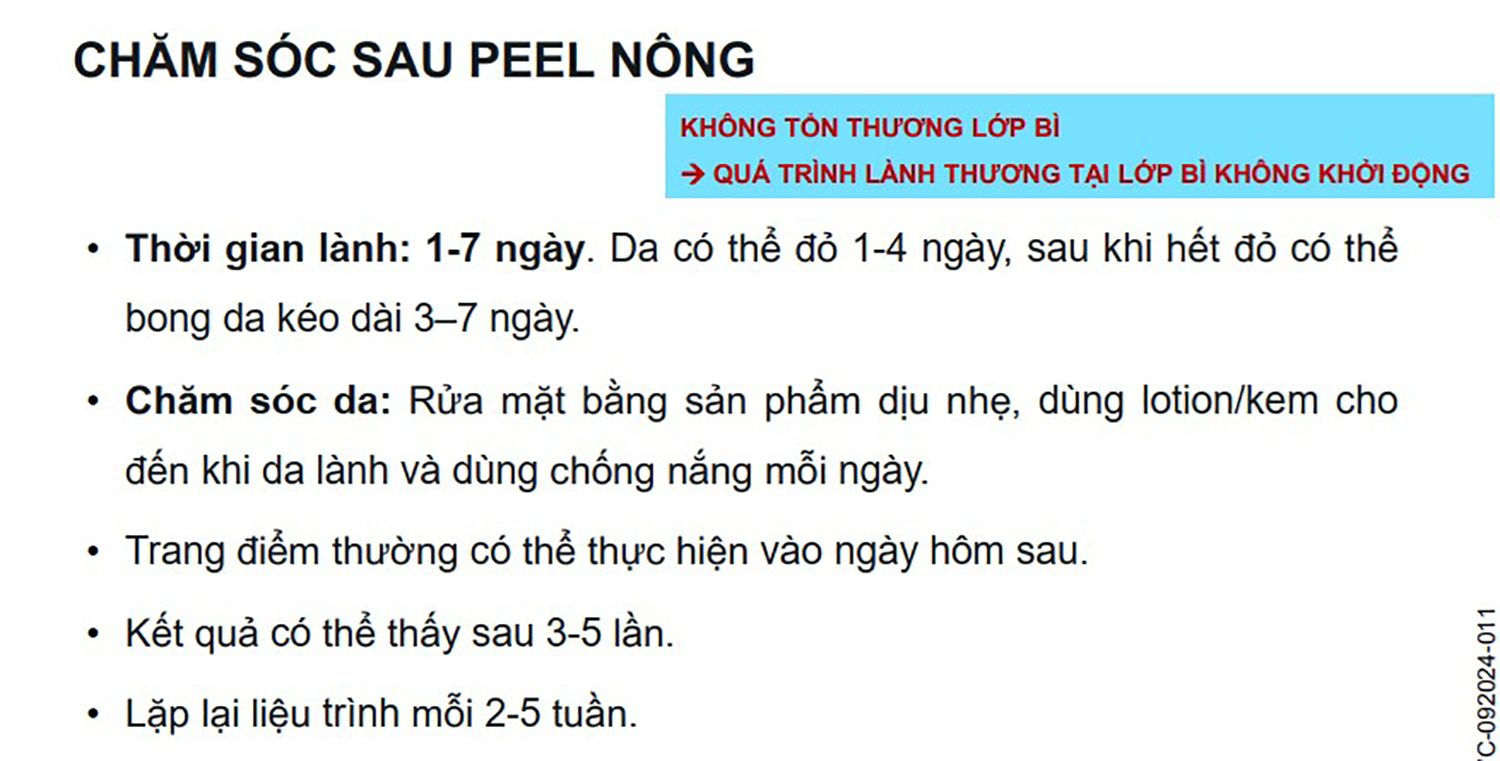 Từ ngày thứ 3, các sản phẩm chăm sóc da có khả năng cung cấp độ ẩm, tăng cường tốc độ phục hồi và giảm thiểu các phản ứng viêm là điều cần thiết. Đối với vấn đề tăng sắc tố sau viêm cần tăng cường hoạt chất chống oxy hóa và chống nắng thật kỹ.