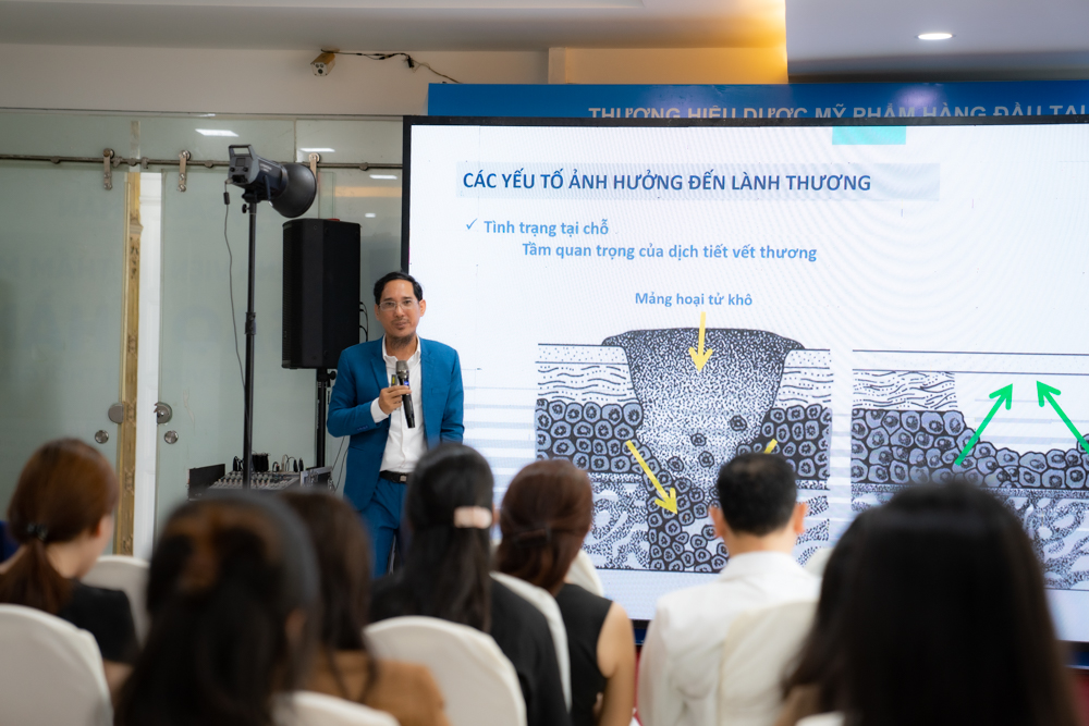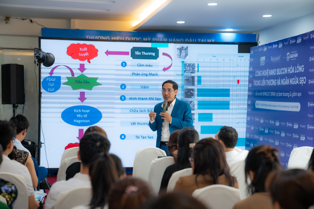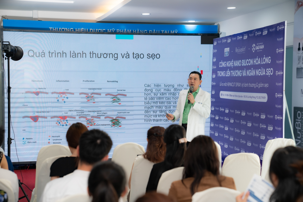 Chính vì thế, với chuyên đề “Giải pháp tối ưu để quản lý sẹo ngay giai đoạn đầu tiên”, TS.BS Lê Tôn Dũng cũng đặc biệt tập trung mang đến thông tin hữu ích và trọng tâm giúp khách mời thấu hiểu tiến trình lành thương tự nhiên của vết mổ. Đồng thời, hướng dẫn cách chăm sóc, quản lý vết thương đúng chuẩn, lành nhanh và ít để lại sẹo xấu. Trong đó, Xịt lành thương và giảm sẹo HemaCut Spray được ưu tiên bởi công thức Silicone y tế hoá lỏng đóng vai trò như “băng gạc” sinh học giúp bảo vệ và nuôi dưỡng vết thương.